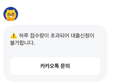 한도와 금리가 조회되고 나면, 대출 신청하기를 하실 수 있습니다. 조회 화면 하단의 대출 신청하기 버튼을 선택하면 대출이 신청이 돼야 하는데..... 하루 접수량 초과라는 메시지가 나오면서 더 이상 대출이 진행이 되지가 않았습니다.